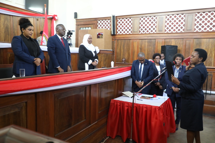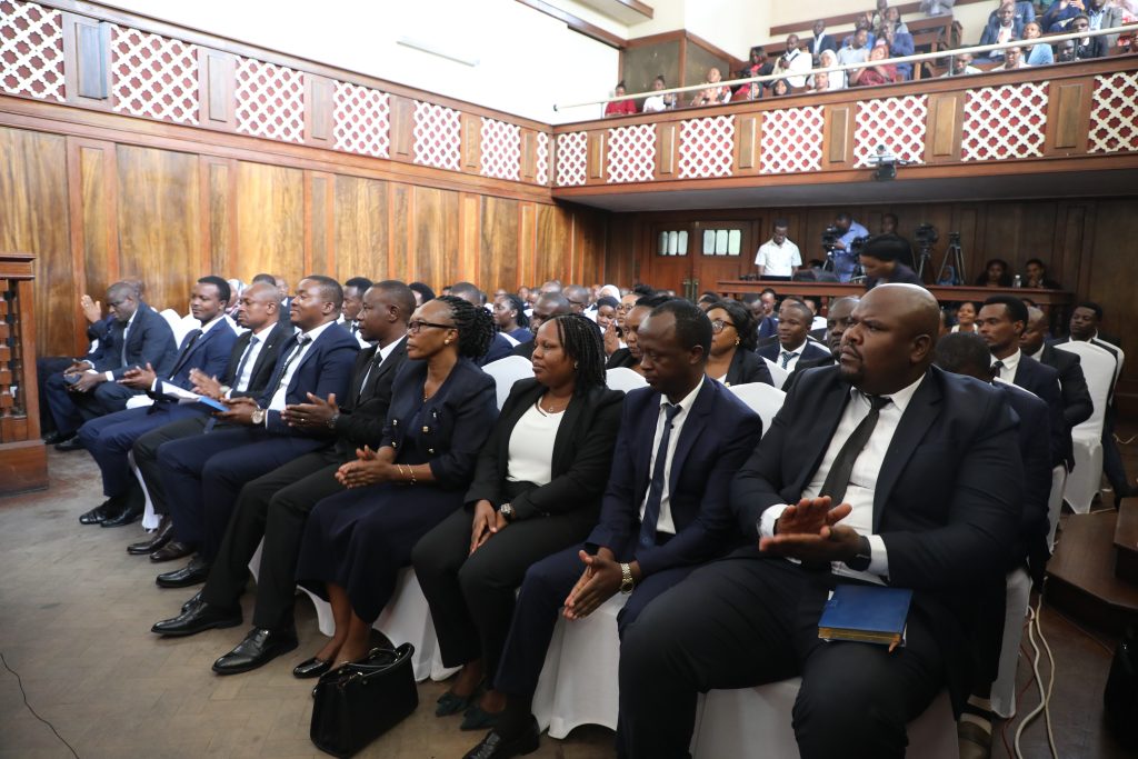Jaji Mkuu wa Tanzania, Mhe. Prof. Ibrahim Hamis Juma (katikati waliosimama mstari wa juu) akishudia Hakimu Mkazi mpya akila kiapo katika hafla hiyo ya uapisho, Wengine ni Jaji wa Mahakama Kuu ya Tanzania Masjala Kuu na Kaimu Jaji Kiongozi, Mhe. Latifa Mansoor (kushoto mstari wa juu) na Jaji Mfawidhi Mahakama Kuu, Kanda ya Dar es Salaam, Mhe. Salma Maghimbi (wa kwanza kulia mstari wa juu).