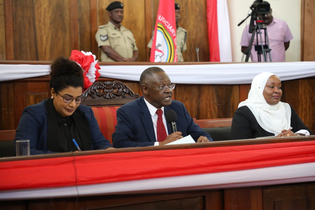 Jaji Mkuu wa Tanzania, Mhe. Prof. Ibrahim Hamis Juma (katikati walioketi) akitoa hotuba mara baada ya kuwaapisha Mahakimu Wakazi 38 Wapya (hawapo pichani) katika hafla iliyofanyika Mahakama Kuu jijini Dar es salaam, Wengine ni Jaji wa Mahakama Kuu ya Tanzania Masjala Kuu na Kaimu Jaji Kiongozi, Mhe. Latifa Mansoor (kushoto) na Jaji Mfawidhi Mahakama Kuu, Kanda ya Dar es Salaam, Mhe. Salma Maghimbi (kulia)