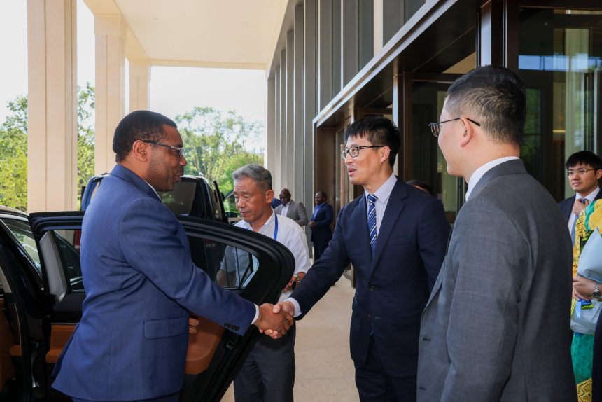 Waziri wa Fedha wa Tanzania, Mhe. Dkt. Mwigulu Lameck Nchemba Madelu (Mb), akipokelewa na Makamu wa Rais wa Kampuni ya Mawasiliano ya Huawei Bw. Zhang, Alipoongoza ujumbe wa Tanzania kutembelea Kampuni hiyo mjini Beijing, China, na kujadili masuala ya uwekezaji wa Kampuni hiyo nchini Tanzania.