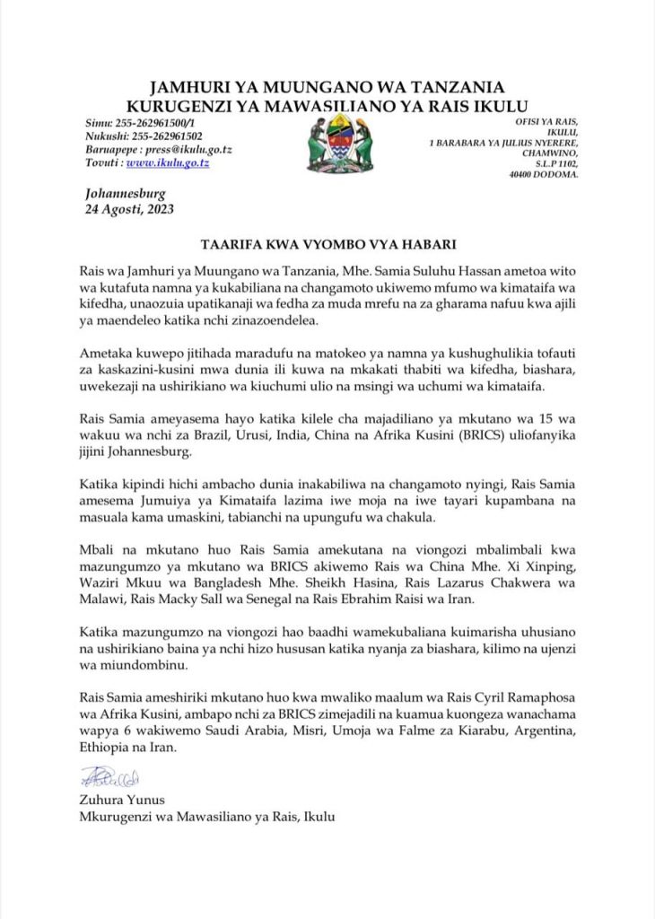 Rais wa Jamhuri ya Muungano wa Tanzania Mhe. Samia Suluhu Hassan akizungumza jambo na Rais wa Afrika Kusini Mhe. Cyril Ramaphosa kando ya mkutano wa 15 wa BRICS unaofanyika Jijini Johannesburg nchini Afrika Kusini tarehe 24 Agosti, 2023.