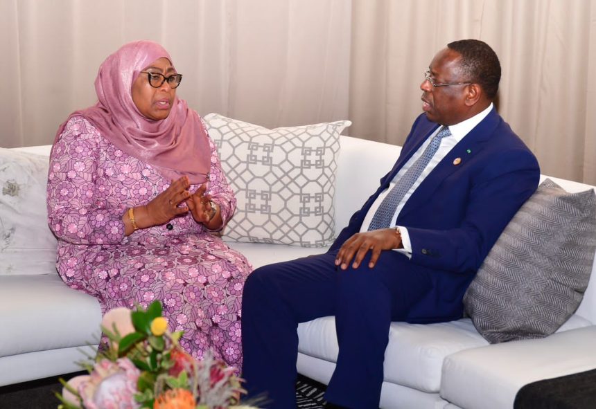 Rais wa Jamhuri ya Muungano wa Tanzania Mhe. Samia Suluhu Hassan akiwa kwenye mazungumzo na Rais wa Senegal Mhe. Macky Sall kando ya mkutano wa 15 wa BRICS unaofanyika Jijini Johannesburg nchini Afrika Kusini tarehe 24 Agosti, 2023.