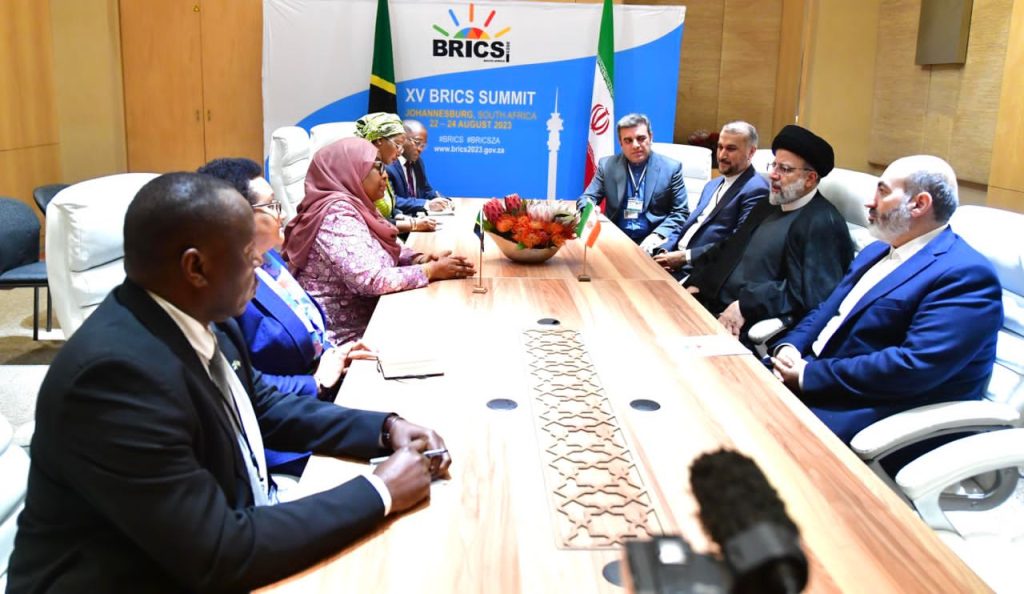 Rais wa Jamhuri ya Muungano wa Tanzania Mhe. Samia Suluhu Hassan akiwa kwenye mazungumzo na Rais wa Iran Mhe. Dkt. Seyyed Ebrahim Raisi kabla ya kuanza mazungumzo kando ya mkutano wa 15 wa BRICS unaofanyika Jijini Johannesburg nchini Afrika Kusini tarehe 24 Agosti, 2023.