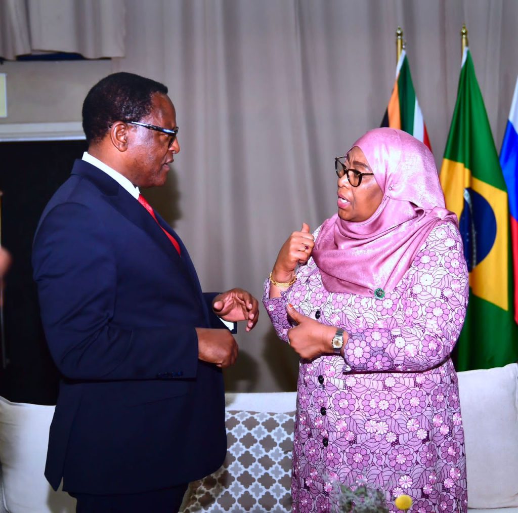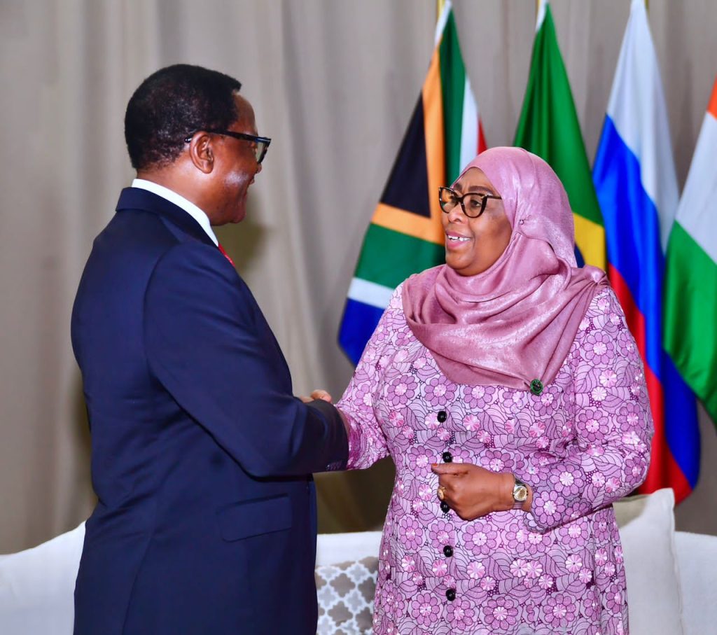 Rais wa Jamhuri ya Muungano wa Tanzania Mhe. Samia Suluhu Hassan akizungumza jambo na Rais wa Malawi Mhe. Lazarus Chakwera kando ya mkutano wa 15 wa BRICS unaofanyika Jijini Johannesburg nchini Afrika Kusini tarehe 24 Agosti, 2023.