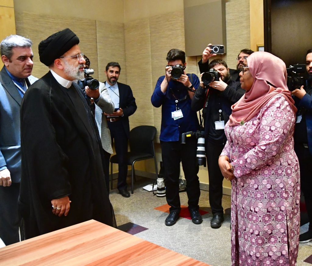 Rais wa Jamhuri ya Muungano wa Tanzania Mhe. Samia Suluhu Hassan akisalimiana na Rais wa Iran Mhe. Dkt. Seyyed Ebrahim Raisi kabla ya kuanza mazungumzo kando ya mkutano wa 15 wa BRICS unaofanyika Jijini Johannesburg nchini Afrika Kusini tarehe 24 Agosti, 2023.