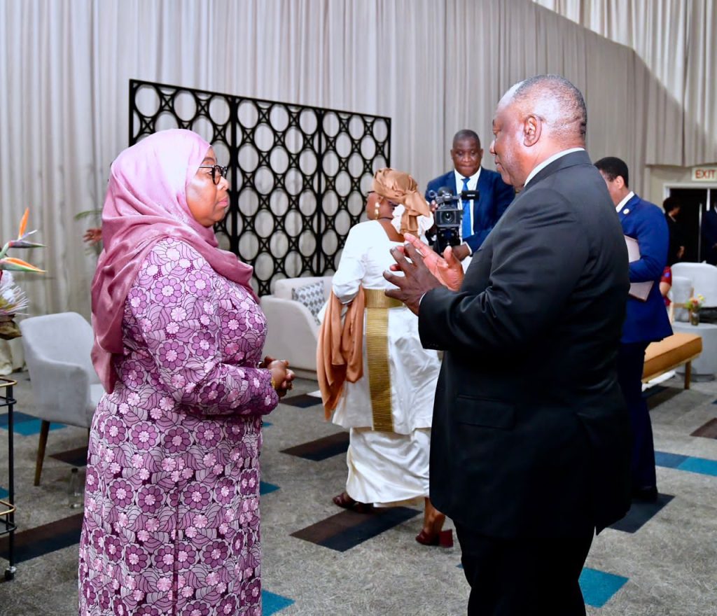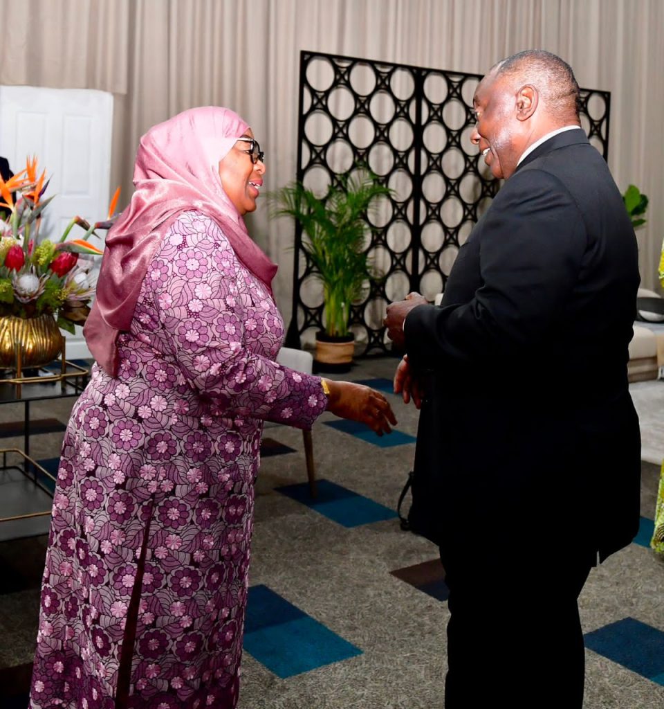 Rais wa Jamhuri ya Muungano wa Tanzania Mhe. Samia Suluhu Hassan akizungumza jambo na Rais wa Afrika Kusini Mhe. Cyril Ramaphosa kando ya mkutano wa 15 wa BRICS unaofanyika Jijini Johannesburg nchini Afrika Kusini tarehe 24 Agosti, 2023.