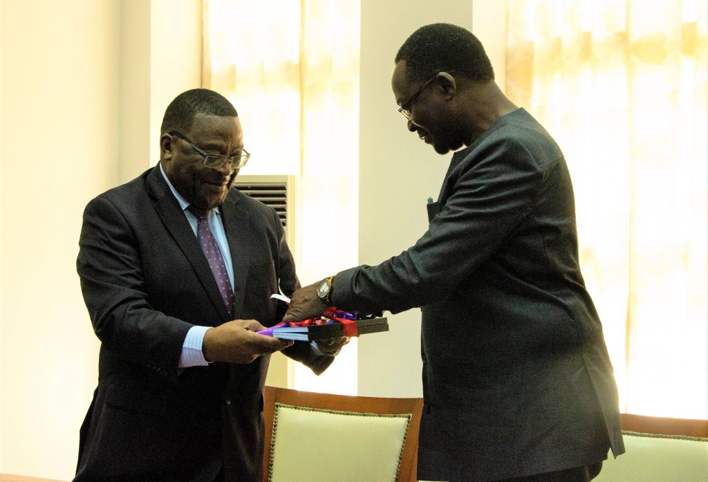 Waziri wa Nchi, Ofisi ya Rais, Menejimenti ya Utumishi wa Umma na Utawala Bora, Mhe. George Simbachawene akikabidhi vitendea kazi kwa Mwenyekiti wa Bodi ya Ushauri ya Wakala wa Ndege za Serikali, Prof. Mhandisi, Idrissa Mshoro, mara baada ya Waziri huyo kuzindua Bodi ya Ushauri ya Wakala hiyo jijini Dar es Salaam.
