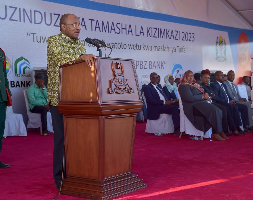 RAIS wa Zanzibar na Mwenyekiti wa Baraza la Mapinduzi Mhe.Dk.Hussein Ali Mwinyi akihutubia katika hafla ya uzinduzi wa Tamasha la Kizimkazi 2023 katika viwanja vya kashangae Paje Wilaya ya Kusini Mkoa wa Kusini Unguja