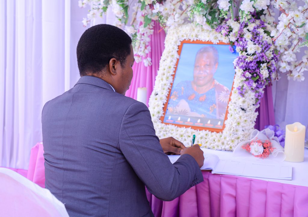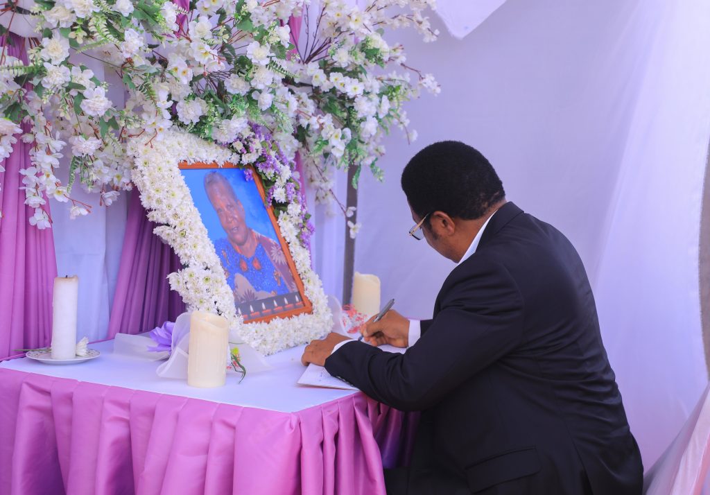 Naibu Katibu Mkuu Ofisi ya Makamu wa Rais (Mazingira) Dkt. Switbert Mkama akiweka Saini katika kitabu cha maombolezo ya kifo cha Dada wa Makamu wa Rais wa Jamhuri ya Muungano wa Tanzania Mhe. Dkt. Philip Mpango Marehemu Bi. Maria Isdor Nzabhayanga mara baada ya kuwasili msibani katika Kijiji cha Kipalapala mkoani Tabora