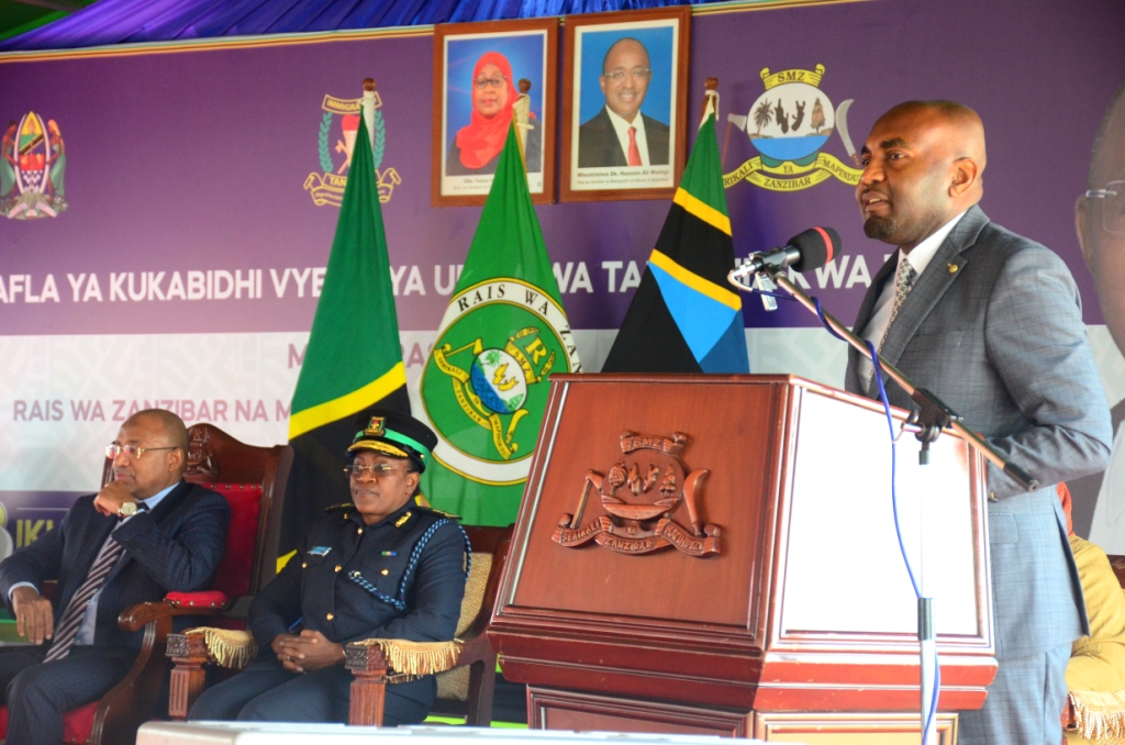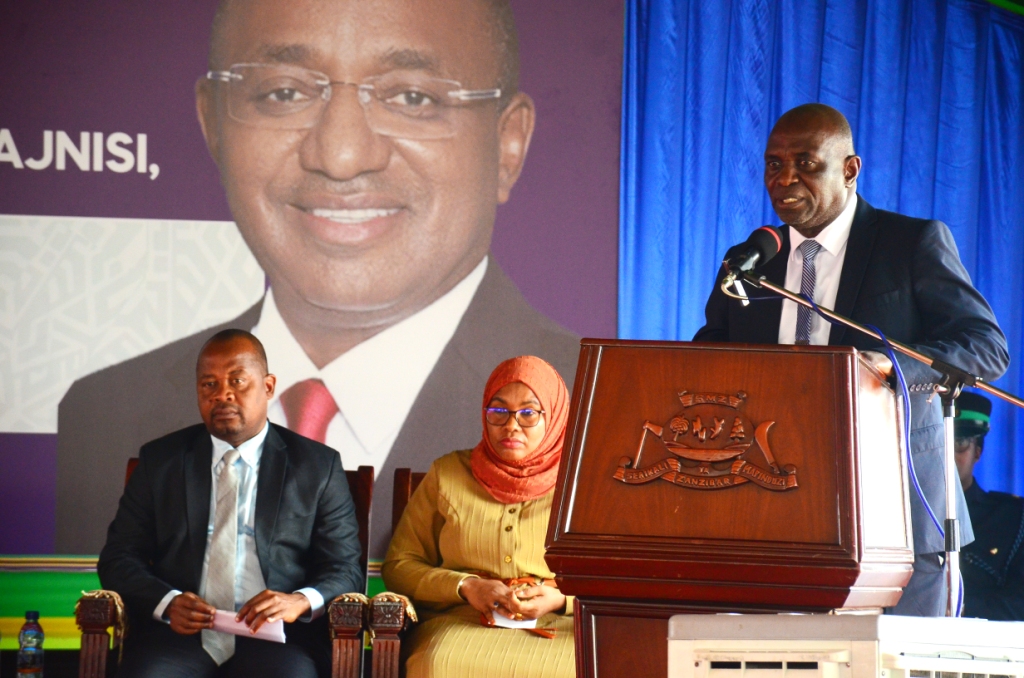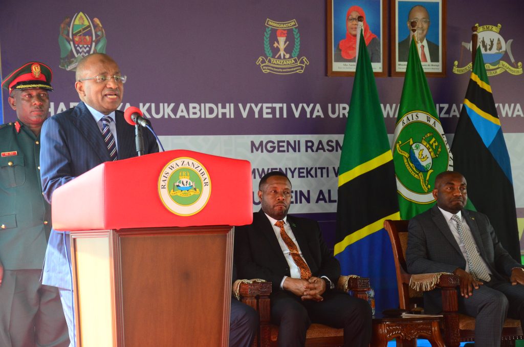 Waziri wa Mambo ya Ndani wa Jamhuri ya Muungano wa Tanzania Hamadi Yussuf Masauni akitoa hotuba katika Hafla ya kukabidhi vyeti kwa Raia wa Tanzania kwa Tajnisi Ikulu jijini Zanzibar.