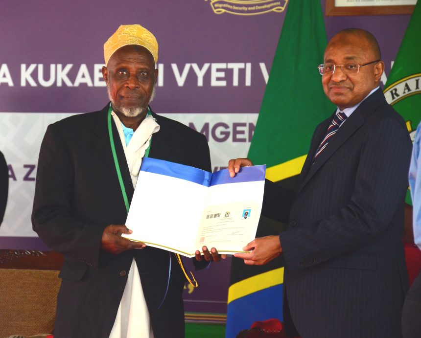 Rais wa Zanzibar na Mwenyekiti wa Baraza la Mapinduzi Dk Hussein Ali Mwinyi akimkabidhi Cheti cha Uraia Mzee Yussuf Awastadhi Bizman Mwene asili ya Rwanda aliezaliwa Zanzibar.katika Hafla ya kukabidhi vyeti kwa Raia wa Tanzania kwa Tajnisi Ikulu jijini Zanzibar.