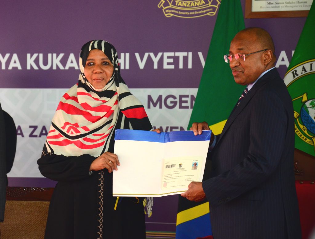 Rais wa Zanzibar na Mwenyekiti wa Baraza la Mapinduzi Dk Hussein Ali Mwinyi akimkabidhi Cheti cha Uraia Bi Miskiya Ali Mohamed Mwenye asili ya Komoro aliezaliwa Zanzibar.katika Hafla ya kukabidhi vyeti kwa Raia wa Tanzania kwa Tajnisi Ikulu jijini Zanzibar.