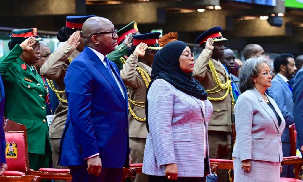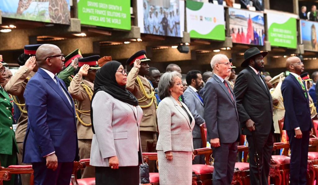 Rais wa Jamhuri ya Muungano wa Tanzania Mhe. Samia Suluhu Hassan akiwa amesimama na Wakuu wa Nchi na Serikali pamoja na Viongozi wa Taasisi mbalimbali za Kimataifa wakati wa Wimbo wa Umoja wa Afrika (AU) na ule wa Taifa wa Kenya ukiimbwa mara baada ya kuwasili katika Kituo cha Mikutano cha Kimataifa cha Kenyatta (KICC) Nairobi nchini Kenya tarehe 05 Septemba, 2023 kwa ajili ya kushiriki Mkutano wa Mabadiliko ya Tabianchi Barani Afrika (Africa Climate Summit 23).