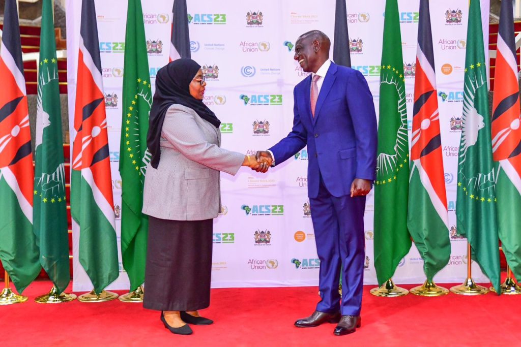 Rais wa Jamhuri ya Muungano wa Tanzania Mhe. Samia Suluhu Hassan akisalimiana na Rais wa Kenya Mhe. William Ruto mara baada ya kuwasili katika Kituo cha Mikutano cha Kimataifa cha Kenyatta (KICC) kwa ajili ya kushiriki Mkutano wa Mabadiliko ya Tabianchi Barani Afrika (Africa Climate Summit 23) Nairobi nchini Kenya tarehe 05 Septemba, 2023