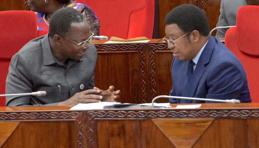 Waziri Mkuu, Kassim Majaliwa akizungumza na Naibu Waziri wa Mambo ya Nje na Ushirikiano wa Afrika ya Mashariki, Balozi Mbarouk Nassoro Mbarouk (kulia), Naibu Waziri wa Mambo ya Nje na Ushirikiano wa Afrika ya Mashariki, Stephen Dkt. Byabato (wa pili kulia) na Naibu Waziri Ofisi ya Rais TAMISEMI, Dkt Festo Dugange, bungeni jijini Dodoma Septemba 6, 2023. (Picha na Ofisi ya Waziri Mkuu)