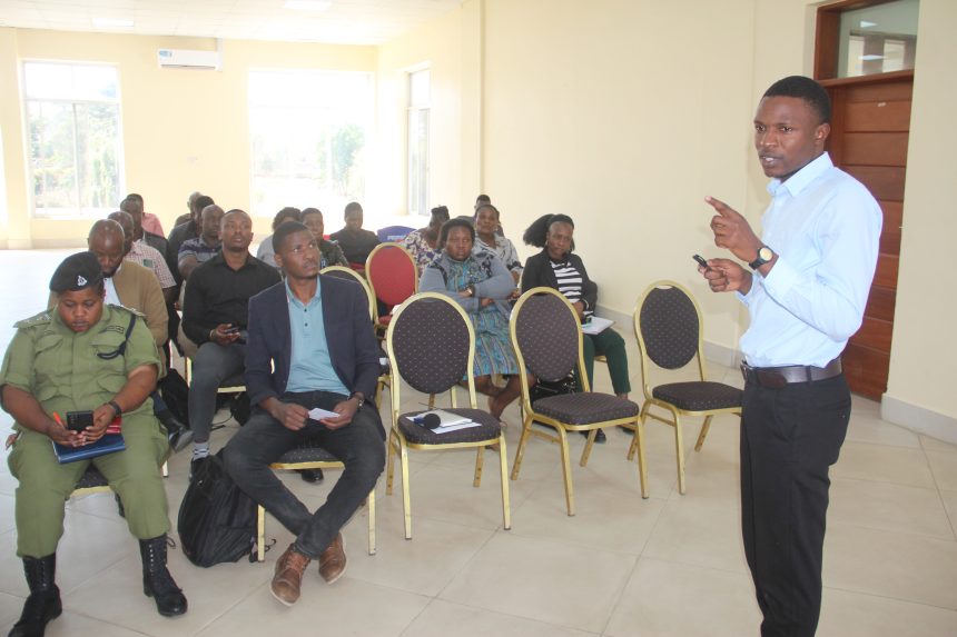 Afisa Maendeleo ya Jamii kutoka Wizara ya Maendeleo ya Jamii, Jinsia, Wanawake na Makundi Maalumu, Joel Mwakapala akitoa salamu za serikali kwenye Kikao cha Tathmini ya Robo ya Tatu ya Utekelezaji wa Programu Jumuishi ya Taifa ya Malezi, Makuzi na Maendeleo ya Awali ya Mtoto(PJT-MMMAM) mkoa wa Mbeya.