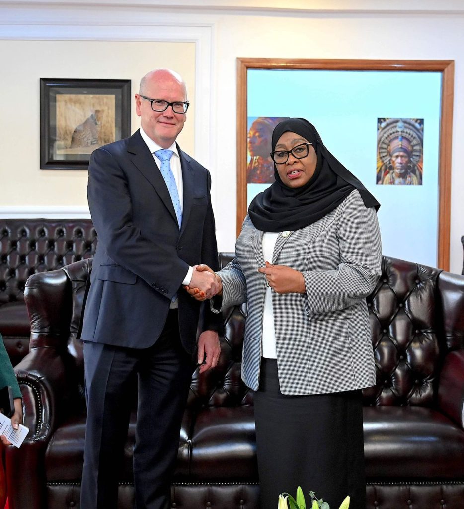Rais wa Jamhuri ya Muungano wa Tanzania Mhe. Samia Suluhu Hassan akiwa kwenye picha ya pamoja na Makamu wa Rais wa Benki ya Uwekezaji ya Ulaya (EIB) Bw. Thomas Östros kando ya Mkutano wa Mabadiliko ya Tabianchi Africa (Africa Climate Summit 23) unaofanyika katika Jiji la Nairobi Nchini Kenya.