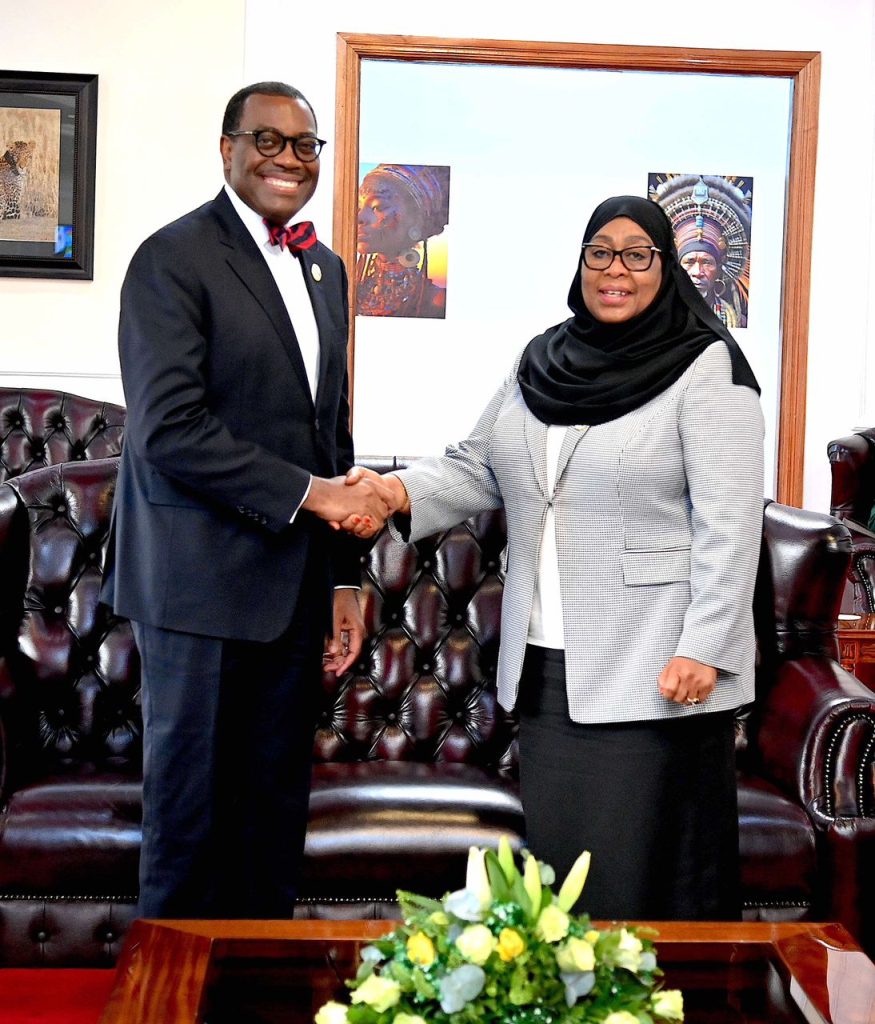 Rais wa Jamhuri ya Muungano wa Tanzania Mhe. Samia Suluhu Hassan, akisalimiana na Rais wa Benki ya Maendeleo Afrika (AfDB) Akinwumi Adesina kando ya Mkutano wa Mabadiliko ya Tabianchi Africa (Africa Climate Summit 23) unaofanyika katika Jiji la Nairobi Nchini Kenya.