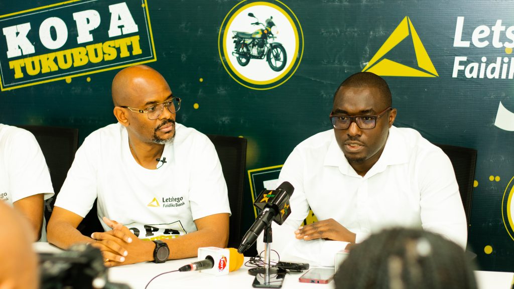 Mkaguzi wa Bodi ya Michezo ya Kubahatisha nchini Joram Mtafya (kulia) akizungumza wakati wa uzinduzi wa kampeni ya Kopa Tukubusti ya benki ya Letshego Faidika. Kushoto ni Afisa Mtendaji Mkuu wa benki ya Leshego Faidika, Baraka Munsi. Kampeni ya Kopa Tukubusti ina lengo la kuwafaidisha wateja wao kwa kushinda zawadi mbalimbali ikiwa pamoja na fedha taslimu. Kupitia kampeni hiyo, mteja anaweza kushinda hadi asilimia 50 ya fedha alizokopa katika benki hiyo.