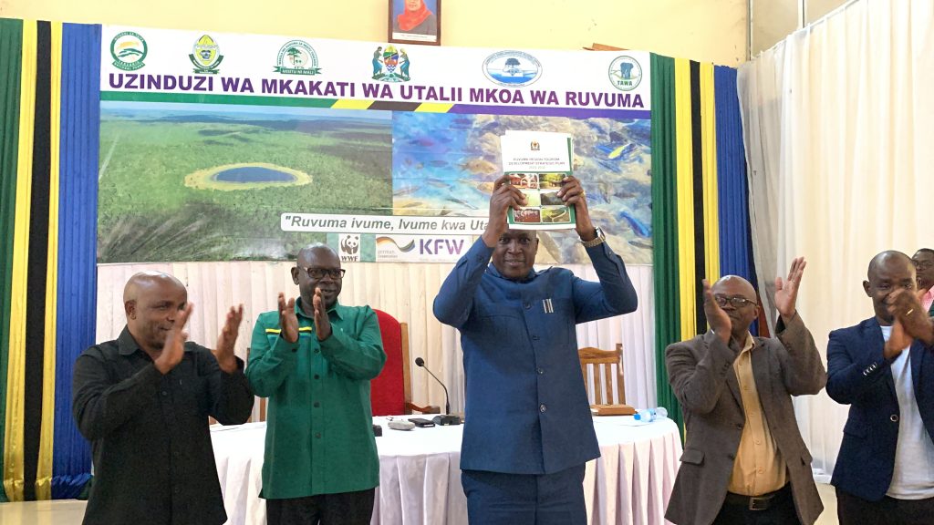 Mkuu wa Mkoa wa Ruvuma Kanali Laban Thomas akionesha juu nakala za Mkakati wa Utalii Mkoa wa Ruvuma baada ya kuzinduliwa kwenye ukumbi wa Manispaa ya Songea na kushirikisha wadau kutoka ndani ya Mkoa na wawakishiriki wa Wizara ya Maliasili na Utalii na wadau wengine wa uhifadhi wa kimataifa wakiwemo WWF ,PALM na GIZ