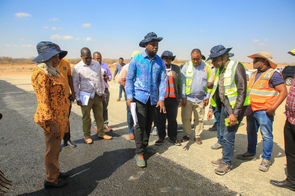 Waziri wa Ujenzi, Innocent Bashungwa, akikagua ujenzi wa barabara ya kuruka na kutua ndege katika Kiwanja cha Ndege cha Kimataifa cha Msalato ambapo umefikia asilimia 36. jijini Dodoma.