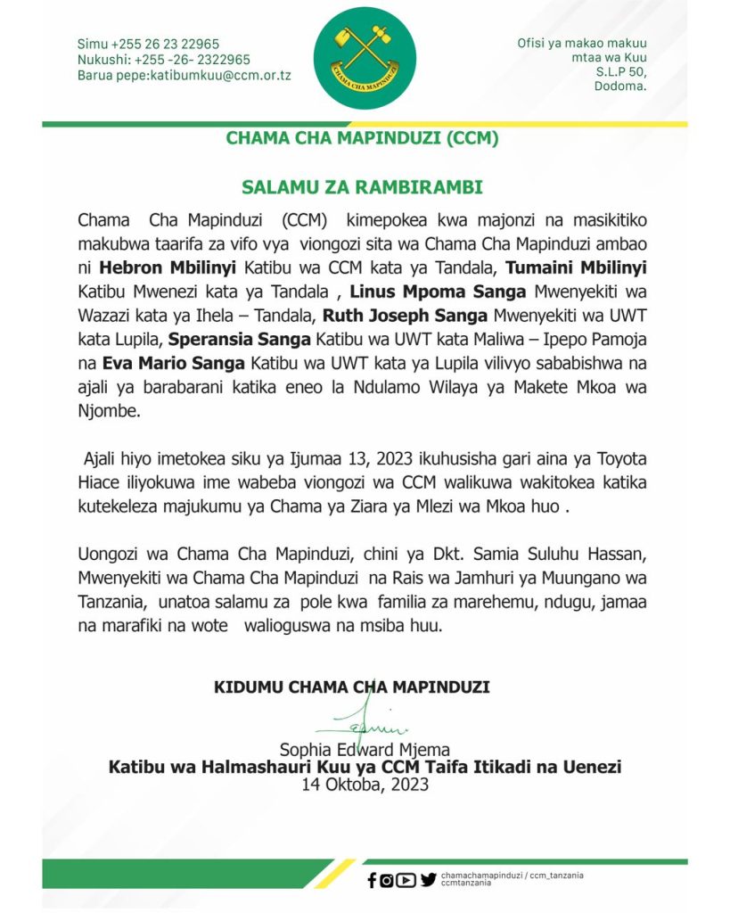 SiasaCCM YATUMA SALAMU ZA RAMBIRAMBI KUFUATIA VIFO VYA VIONGOZI SITA WA CCM WILAYANI MAKETE Last updated: 2023/10/14 at 2:43 PM John Bukuku 2 years ago Share SHARE John Bukuku October 14, 2023 October 14, 2023 Share this Article Facebook Twitter Email Print Previous Article MKUU WA WILAYA RUNGWE AKAGUA UJENZI WA MRADI WA UMEME WA JOTO ARDHI ISONGOLE Next Article MIRADI YA REGROW KICHOCHEO ONGEZEKO LA WATALII HIFADHI YA TAIFA NYERERE