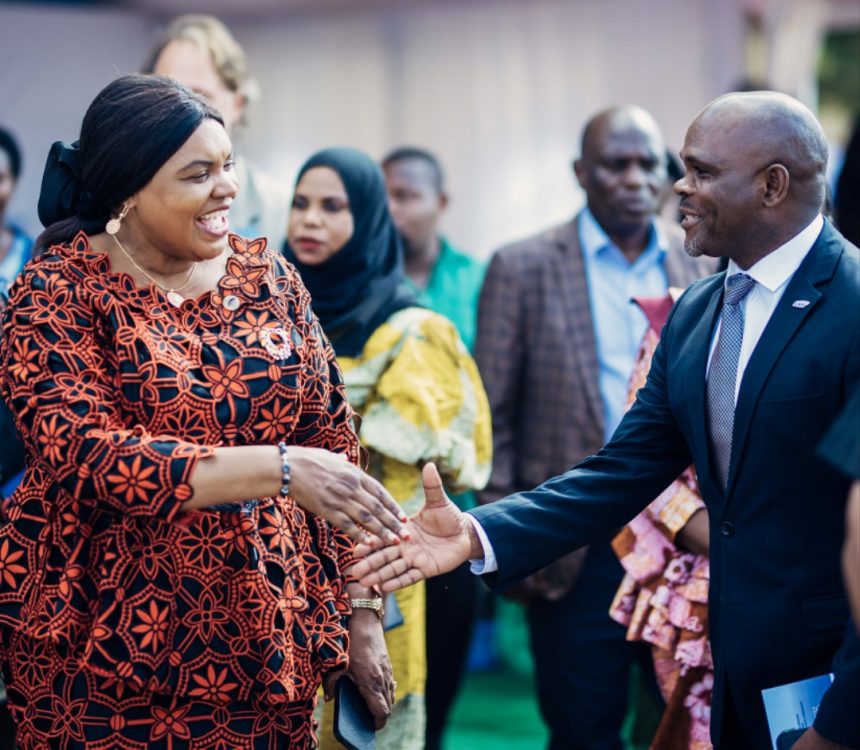 Waziri wa Nchi Ofisi ya Waziri Mkuu, Sera, Bunge na Uratibu, Mhe. Jenista Mhagama akisalimiana na Meneja wa Benki ya NMB Kanda ya Kaskazini – Baraka Ladislaus alipotembelea banda la Benki hiyo wakati wa uzinduzi wa Wiki ya Vijana kitaifa Wilayani Babati, Manyara.