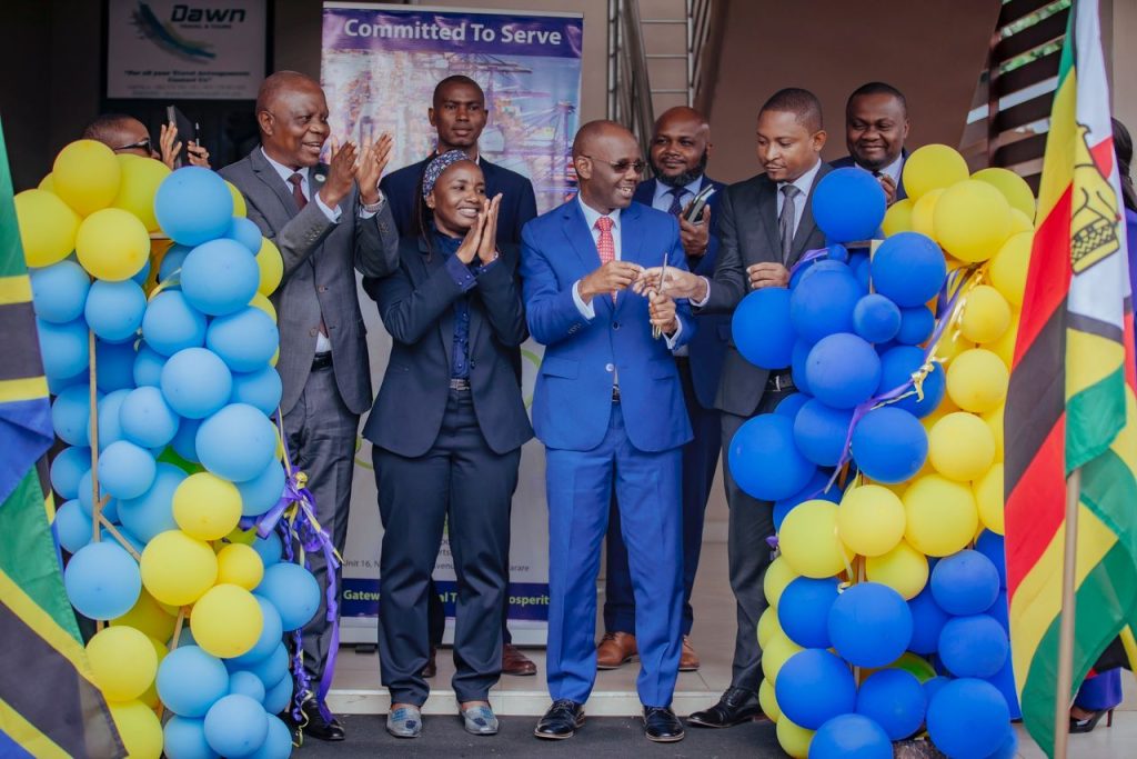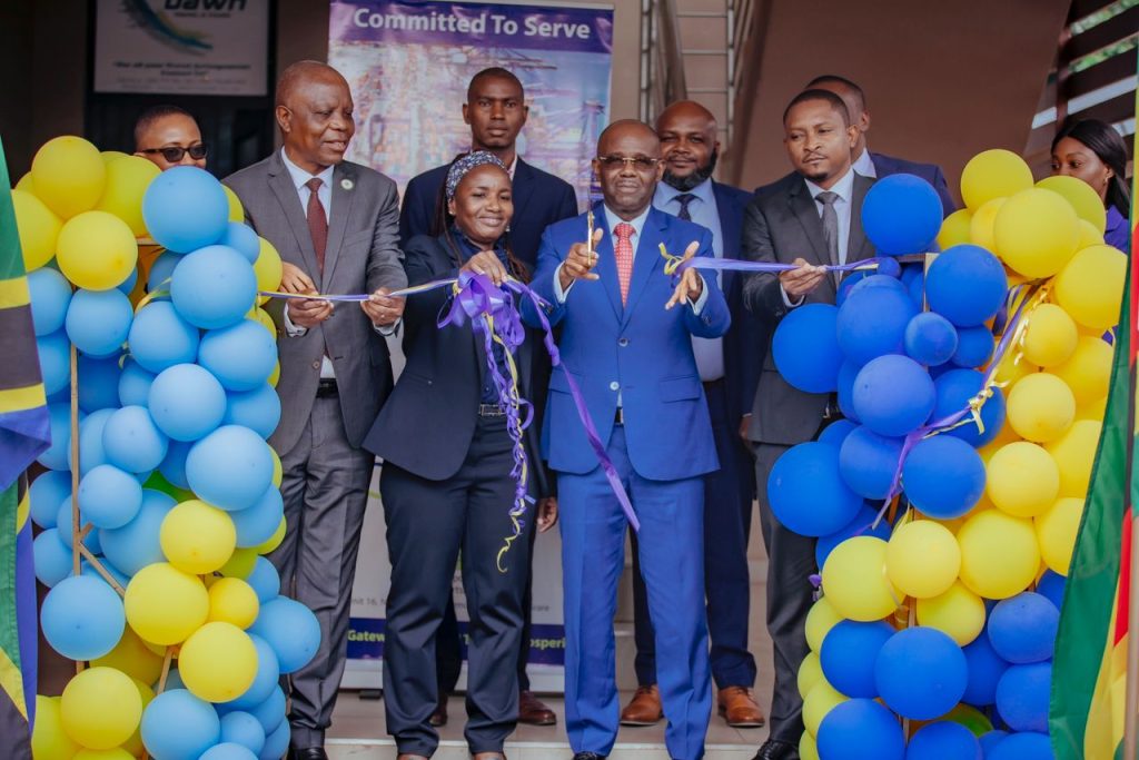 Waziri wa Uchukuzi Mhe. Profesa Makame Mbarawa (katikati) na Katibu Mkuu wa Wizara ya Uchukuzi na Maendeleo ya Miundombinu Nchini Zimbabwe Mhe. Mha. Joy Makumbe (wa pili kushoto ), wakikata utepe kuashiria uzinduzi rasmi wa Ofisi ya Mamlaka ya Usimamizi wa Bandari Tanzania (TPA) Jijini Harare nchini Zimbabwe, tarehe 16 Oktoba, 2023.