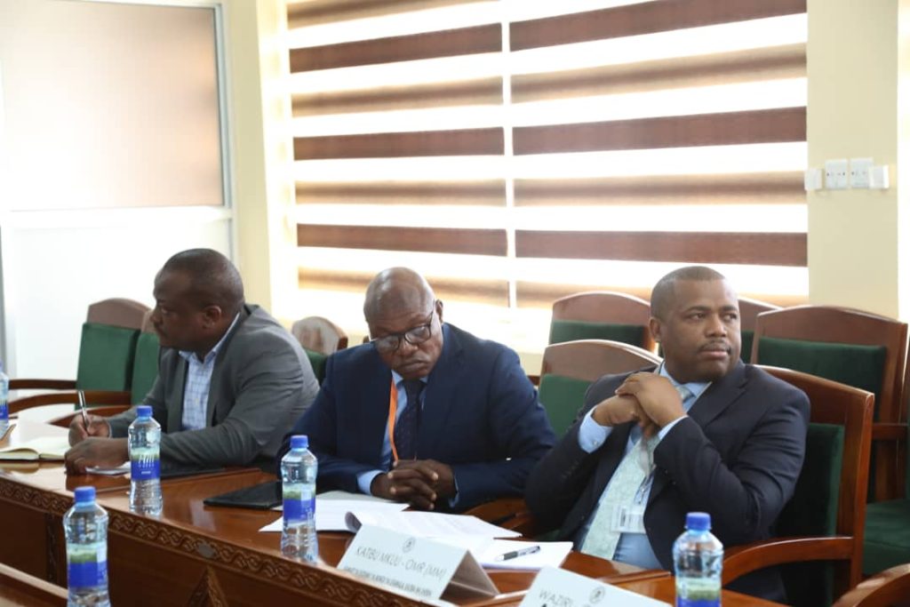 Kaimu Katibu Mkuu Ofisi ya Makamu wa Rais Bw. Abdallah Hassan Mitawi (kulia) na wataalamu kutoka Ofisi hiyo wakiwa katika kikao cha kuwasilisha taarifa ya Ofisi ya Makamu wa Rais kuhusu utatuzi wa changamoto za Muungano kwa Kamati ya Kudumu ya Bunge ya Utawala, Katiba na Sheria iliyowasilishwa na Waziri wa Nchi Ofisi ya Makamu wa Rais (Muungano na Mazingira) Mhe. Dkt. Selemani Jafo (hayupo pichani), jijini Dodoma.