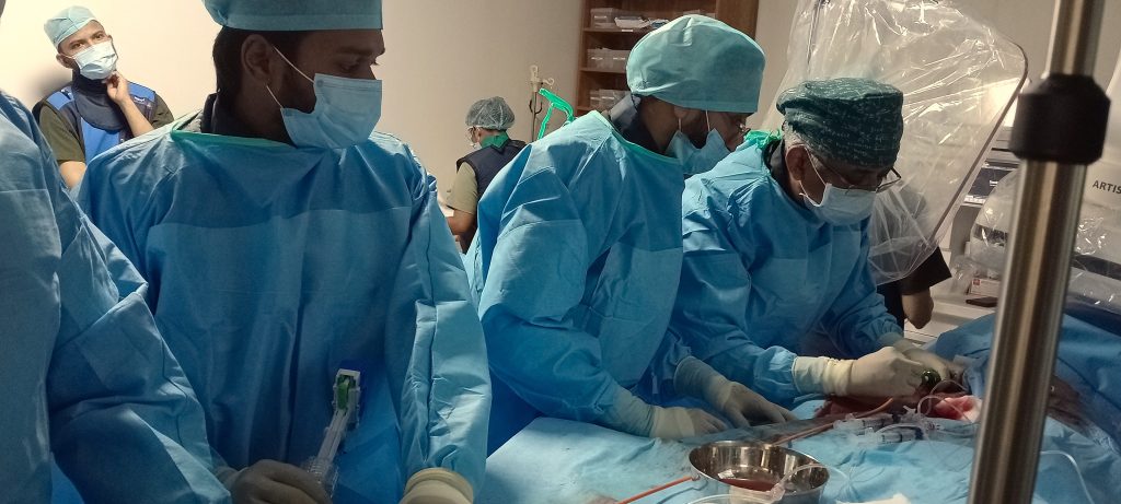 Wataalamu wa magonjwa ya moyo na mishipa ya damu wa Taasisi ya Moyo Jakaya Kikwete (JKCI) na wenzao wa nchini India wakifanya upasuaji mdogo wa moyo kubadilisha valvu ya mshipa mkubwa wa damu (Aortic Valve) bila kufungua kifua (Transcatheter Aortic Valve Implantation procedure – TAVI) wakati wa mafunzo ya siku tano kwa wataalamu hao yanayoendelea nchini India.