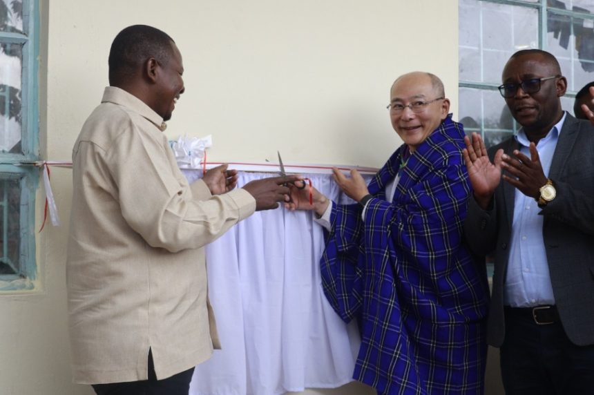 Balozi wa Japan nchini Tanzania Yasushi Misawa, kulia akiwa na Mkuu wa Wilaya ya Hai Amiri wakikata utepe kwenye madarasa 8 na ofisi mbili zilizotolewa na ubalozi huo.
