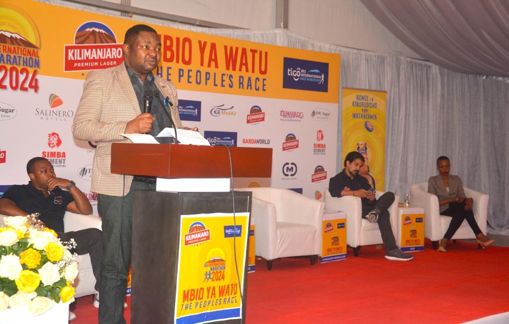 Kaimu Mkurugenzi Mkuu wa Bodi ya Utalii Tanzania, Stephen Mpeka akizungumza wakati wa uzinduzi wa mbio za Kilimanjaro Premium Lager international Marathon 2024 katika hoteli ya Serena Jijini Dar es Salaam.
