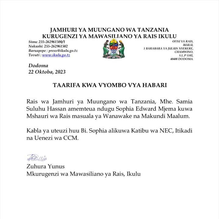 SiasaSOPHIA MJEMA AMETEULIWA KUWA MSHAURI WA RAIS Last updated: 2023/10/22 at 8:38 AM John Bukuku 2 years ago Share SHARE John Bukuku October 22, 2023 October 22, 2023 Share this Article Facebook Twitter Email Print Previous Article BARRICK BULYANHULU YAWEZESHA MAFUNZO YA KANUNI ZA WAJIBU WA WAMILIKI WA LESENI ZA MADINI MSALALA NA NYANG’HWALE Next Article TAARIFA KUTOKA BENKI KUU YA TANZANIA BoT