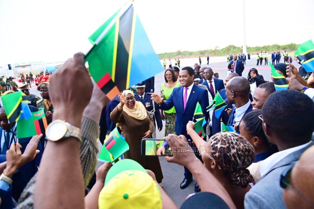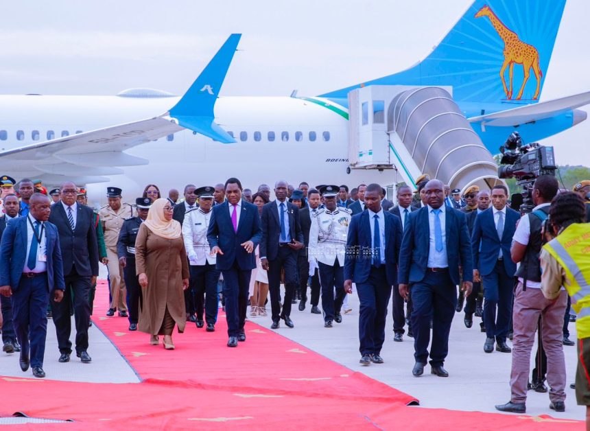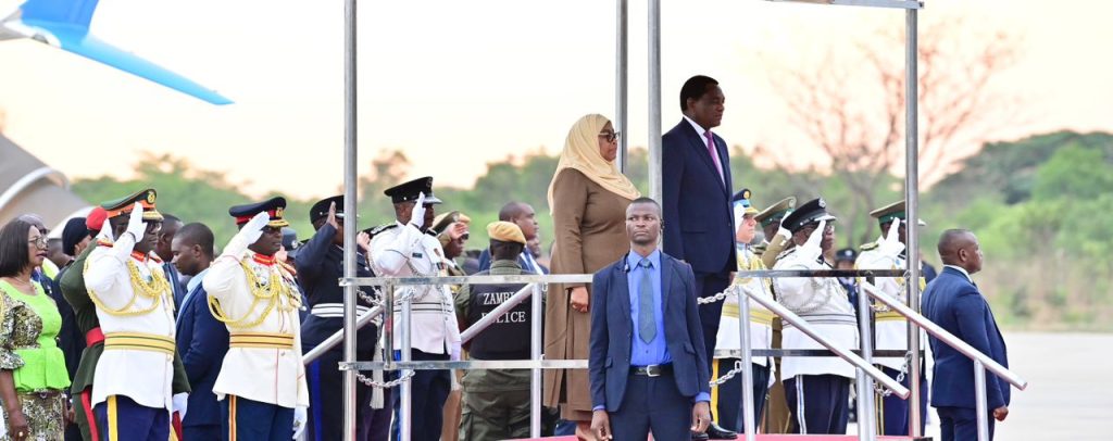 Rais wa Jamhuri ya Muungano wa Tanzania Mhe. Samia Suluhu akiwa na mwenyeji wake Rais wa Zambia Mhe. Hakainde Hichilema wakati wakifurahia vikundi mbalimbali vya burudani mara baada ya kuwasili katika uwanja wa Ndege wa Kimataifa wa Kenneth Kaunda, Lusaka nchini Zambia kwa ajili ya Ziara ya Kitaifa tarehe 23 Oktoba, 2023.