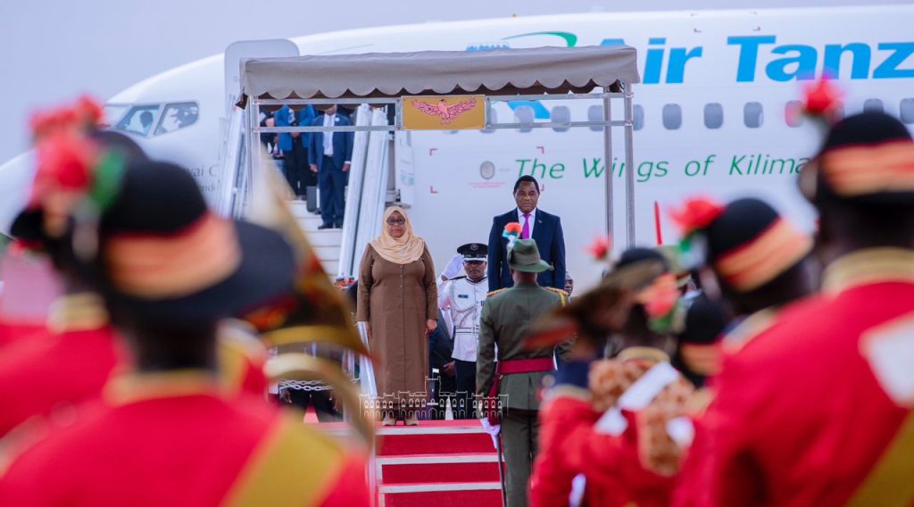 Rais wa Jamhuri ya Muungano wa Tanzania Mhe. Samia Suluhu akiwa amesimama pamoja na mwenyeji wake Rais wa Zambia Mhe. Hakainde Hichilema wakati wa Wimbo wa Taifa wa Tanzania na Zambia ukiimbwa mara baada ya kuwasili katika uwanja wa Ndege wa Kimataifa wa Kenneth Kaunda, Lusaka nchini Zambia tarehe 23 Oktoba, 2023.