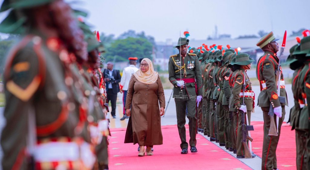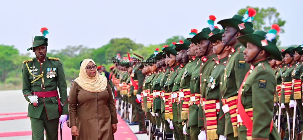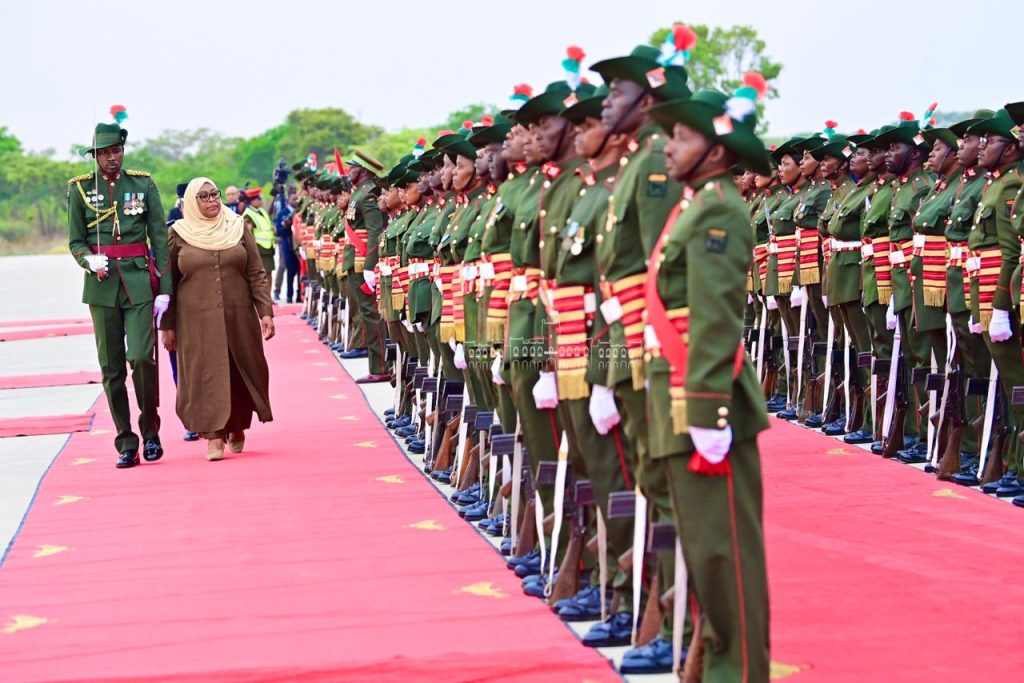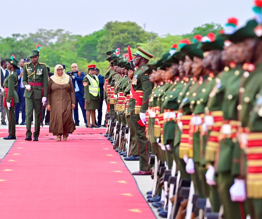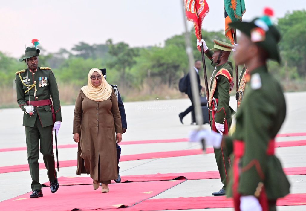 Rais wa Jamhuri ya Muungano wa Tanzania Mhe. Samia Suluhu akikagua Gwaride la Heshima mara baada ya kuwasili katika uwanja wa Ndege wa Kimataifa wa Kenneth Kaunda, Lusaka nchini Zambia kwa ajili ya Ziara ya Kitaifa tarehe 23 Oktoba, 2023.