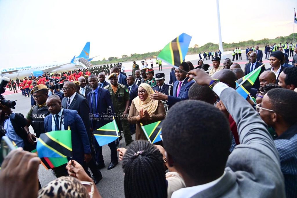 Rais wa Jamhuri ya Muungano wa Tanzania Mhe. Samia Suluhu akiwapungia mkono moja ya kikundi cha ngoma za asili cha Zambia wakati wa mapokezi Rasmi katika uwanja wa Ndege wa Kimataifa wa Lusaka tarehe 23 Oktoba, 2023.