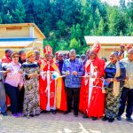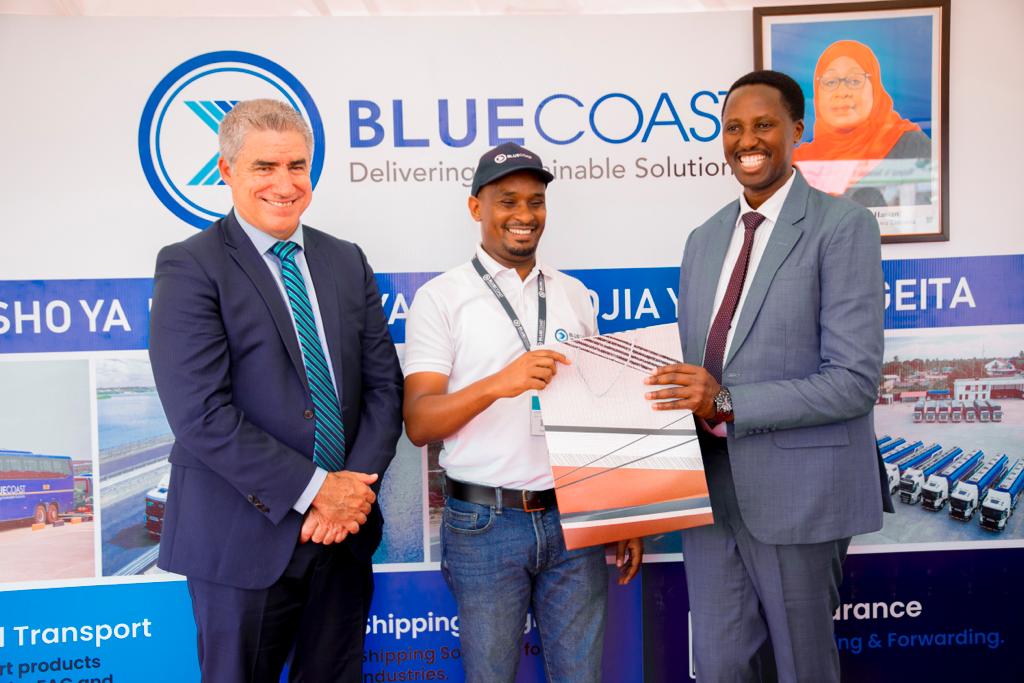 Mkurugenzi Mtendaji wa GGML, Terry Strong (kushoto) na Makamu Rais wa AngloGold Ashanti- GGML anayeshughulikia miradi endelevu Ghana na Tanzania, Simon Shayo (kulia) wakipokea zawadi kutoka kwa mmoja wa wafanyakazi wa Blue Coast.