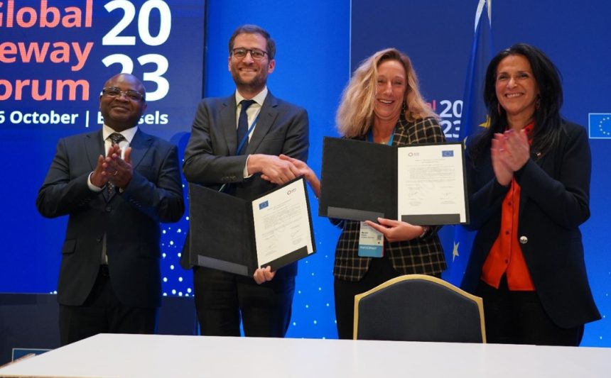 Waziri wa Nchi katika Ofisi ya Rais, Mipango na Uwekezaji, Mhe. Prof. Kitila A. Mkumbo (kushoto) akifurahia baada ya uwekaji saini wa mkataba baina ya EU na Shirika la Maendeleo la Ufaransa (AFD) ambapo EU imetoa msaada (grant) kwa Tanzania wa Euro milioni 36 sawa na Shilingi bilioni 95 kwa ajili ya Mradi wa Uzalishaji wa Umeme kwa njia ya Maji wa Kakono, mkoani Kagera wa MW 87.8).