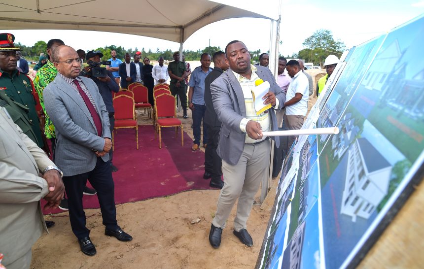 RAIS wa Zanzibar na Mwenyekiti wa Baraza la Mapinduzi Mhe.Dk.Hussein Ali Mwinyi akitembelea Mradi wa Ujenzi wa Kiwanda cha Kusarifu Dagaa Kama “Anchovy Processing Facilities and Livelihood Village at Kama”,akiwa katika ziara yake kukagua mradi huo unaojengwa katika eneo la Kama na (kushoto kwa Rais) Waziri wa Uchumi wa Buluu na Uvuvi Zanzibar Mhe. Suleiman Masoud Makame,Mkuu wa Wilaya ya Magharibi “A” Unguja Mhe. Suzan Kunambi.(Picha na Ikulu).