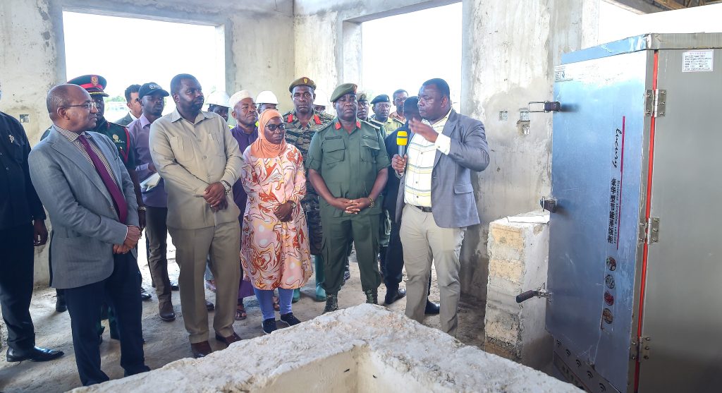 RAIS wa Zanzibar na Mwenyekiti wa Baraza la Mapinduzi Mhe.Dk.Hussein Ali Mwinyi akimsikiliza Mkurugenzi Muendeshaji wa Kampuni ya Uvuvi Zanzibar (ZAFICO) Dr. Ameir Haidar Mshenga, akitowa maelezo ya Jiko la kusarifu dagaa, wakati wa ziara yake kukagua maendeleo ya ujenzi wa mradi wa “Anchovy Processing Facilities and Livelihood Village at Kama” Wilaya ya Magharibi “A” Unguja na (kushoto kwa Rais) Waziri wa Uchumi wa Buluu na Uvuvi Zanzibar Mhe. Suleiman Masoud Makame, Mkuu wa Wilaya ya Magharibi “A” Unguja Mhe. Suzan Kunambi na Mkuu wa JKU Kanali Makame Abdalla Daima.(Picha na Ikulu).