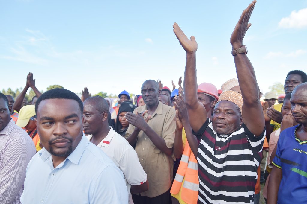 WAFANYAKAZI wa Kampuni ya Ujenzi wa Kiwanda cha Kusarifu Dagaa Kama “Anchovy Processing Facilities and Livelihood Village at Kama” na Wananchi wa Kama wakishangilia wakati Rais wa Zanzibar na Mwenyekiti wa Baraza la Mapinduzi Mhe.Dk.Hussein Ali Mwinyi (hayupo pichani) akizungumza na Wananchi akiwa katika ziara yake kukagua mradi huo 28-10-2023.(Picha na Ikulu).