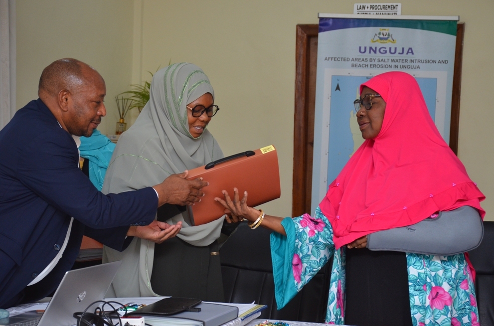 Waziri wa Nchi Ofisi ya Makamu wa Kwanza wa Rais Mhe.Harusi Said Suleiman akimkabidhi kabrasha lenye nyenzo za kufanyia kazi Mwenyekiti wa Bodi ya Maamlaka ya Usimamizi wa Mazingira Zanzibar (ZEMA) Asha Ali Khatib mara baada ya kuizundua bodi hiyo huko Ofisi za Mazingira Maruhubi Mjini Unguja.