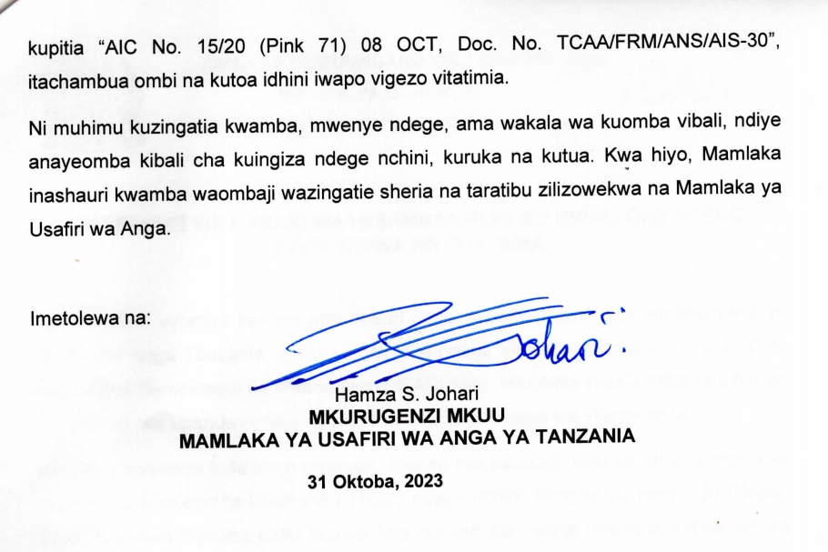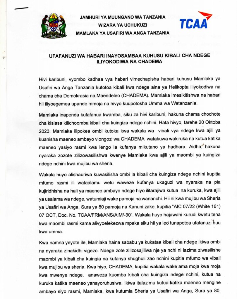 UncategorizedTAARIFA YA UFAFANUZI KUTOKA MAMLAKA YA ANGA TCAA Last updated: 2023/10/31 at 3:13 PM John Bukuku 2 years ago Share SHARE John Bukuku October 31, 2023 October 31, 2023 Share this Article Facebook Twitter Email Print Previous Article TMA YATOA RASMI UTABIRI WA MVUA MAENEO YANAYOPATA MSIMU MMOJA KWA MWAKA Next Article TALGWU: HAKI ZA WAFANYAKAZI NI HAKI ZA BINADAMU