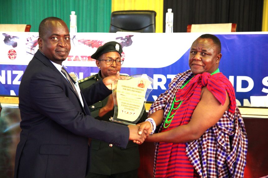 Kaimu Mkurugenzi wa Idara ya Maendeleo ya Utamaduni kutoka Wizara ya Utamaduni, Sanaa na Michezo Dkt. Resani Mnata (kushoto) akipokea tuzo ya heshima ya Rais Mhe. Dkt. Samia Suluhu Hassan, kutoka kwa Mratibu wa Tamasha la Yamnyausi Organization for Arts and Sports (YOAS) Bw. Stewart Mwaluko (kulia) wakati wa hafla ya kufunga tamasha la Utamaduni la Asili Yetu la Mkoa wa Dodoma Novemba 8, 2023 jijini Dodoma. Katikati ni Mgeni Rasmi wa hafla hiyo Kamishna Msaidizi Mwandamizi wa Shirika la Hifadhi za Taifa Tanzania (TANAPA), Dkt. Noelia Muyonga.