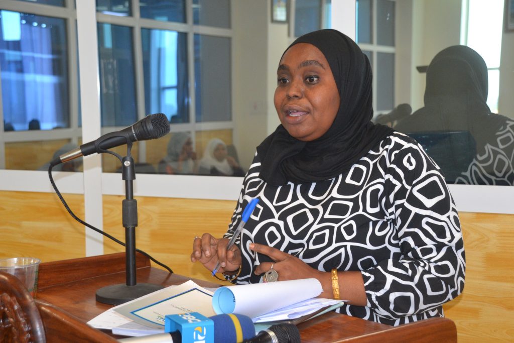 Mkuu wa Divisheni ya Huduma za Jamii Manispaa ya Mjini Mwajuma Al;i Abadi akitolea Ufafanuzi wa Maswala yalioulizwa katika kikao cha 12 cha Madiwani ambacho kilipokea na Kujadili Taarifa za Utekelezaji wa Kazi za Ofisi ya Baraza la Jiji na Kamati za Kudumu za Baraza la Jiji la Zanzibar na Masuala mengine mbalimbali ,Kikao kilicho fanyika katika Ukumbi wa Ofisi ya Mstahiki Meya wa Jiji la Zanzibar Michenzani Mall.