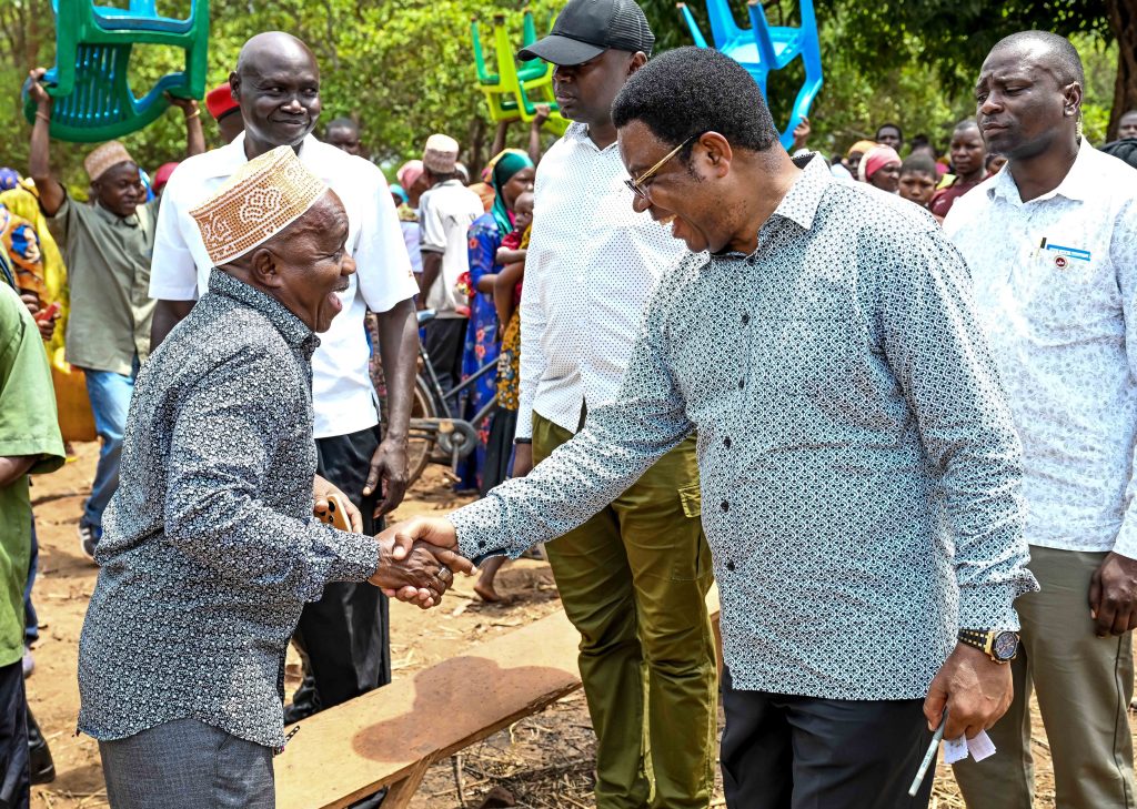 Waziri Mkuu Kassim Majaliwa akisalimiana na na mwananchi wa kijiji cha Namilema, Babuu Abdallah Pamui, akia kwenye ziara ya kukagua miradi ya maendeleo katika Wilaya ya Ruangwa Mkoani Lindi. 15, Novemba 2023. (Picha na Ofisi ya Waziri Mkuu)