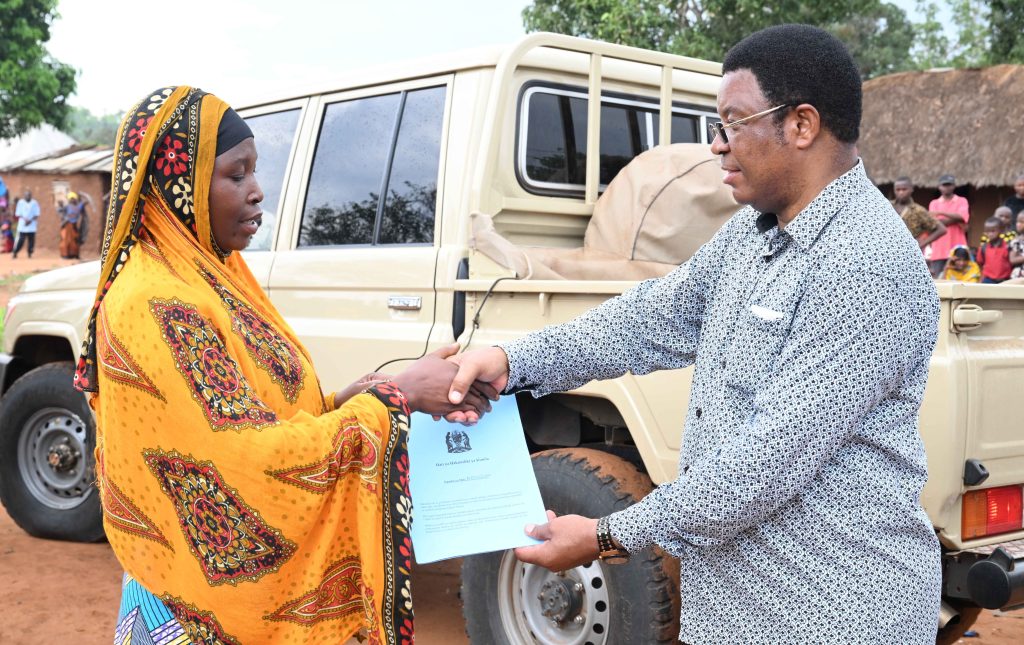 Waziri Mkuu Kassim Majaliwa akikabidhi hati ya umiliki wa ardhi kwa Bi. Somowe Matota, mkazi wa kijiji cha Namkatila, baada ya zoezi la upimaji na mpango wa umiliki bora wa ardhi, akia kwenye ziara ya kukagua miradi ya maendeleo katika Wilaya ya Ruangwa Mkoani Lindi. 15, Novemba 2023. (Picha na Ofisi ya Waziri Mkuu)