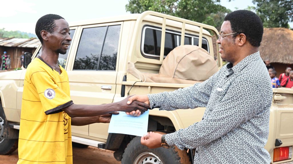 Waziri Mkuu Kassim Majaliwa akikabidhi hati ya umiliki wa ardhi kwa Mussa Milumba, mkazi wa kijiji cha Namkatila, baada ya zoezi la upimaji na mpango wa umiliki bora wa ardhi, akia kwenye ziara ya kukagua miradi ya maendeleo katika Wilaya ya Ruangwa Mkoani Lindi. 15, Novemba 2023. (Picha na Ofisi ya Waziri Mkuu)