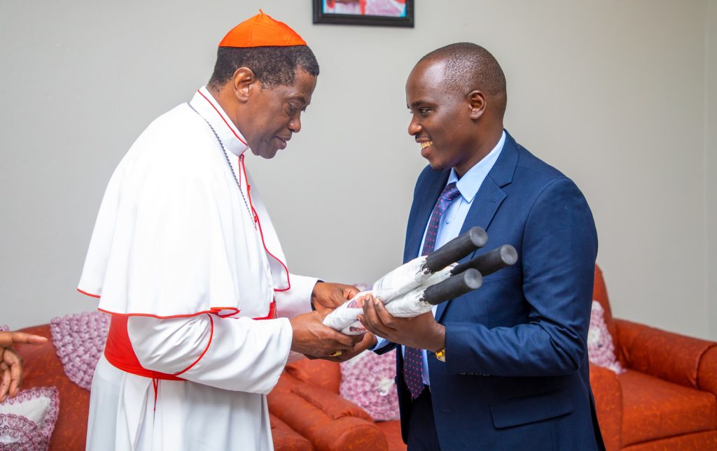 Naibu Waziri Mkuu na Waziri wa Nishati, Mhe. Dkt. Doto Biteko akipokea zawadi ya Miavuli kutoka kwa Askofu Mkuu Mpya wa Tabora, Mwadhama Protase Kardinali Rugambwa baada ya kuwasili katika Makazi ya Baba Askofu mkoani Tabora tarehe 19 Novemba, 2023