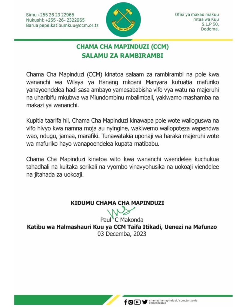 MchanganyikoCCM YATUMA SALAMU ZA RAMBIRAMBI KUFUATIA VIFO VILIVYOSABABISHWA NA MAFURIKO HANANG MANYARA Last updated: 2023/12/03 at 4:29 PM John Bukuku 2 years ago Share SHARE John Bukuku December 3, 2023 December 3, 2023 Share this Article Facebook Twitter Email Print Previous Article SHILINGI BILIONI 1.4 KUMALIZA KERO YA MAJI KATA YA LIKOKONA NA KAMUNDI WILAYANI NANYUMBU Next Article JAMII YAHIMIZWA KUTHAMINI WATU WENYE ULEMAVU